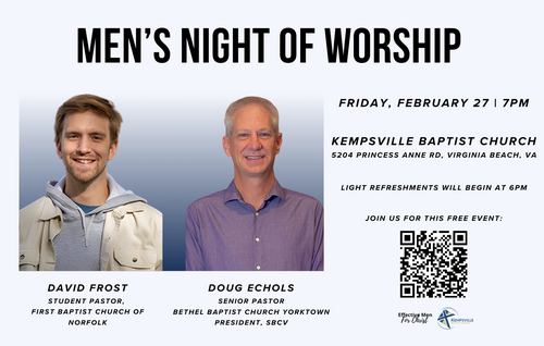 Men, invite your friends, coworkers, and family to join in on a special night of worship. Hear from David Frost, Student Pastor at First Baptist Norfolk, and Doug Echols, Senior Pastor at Bethel Baptist in Yorktown & President of the SBCV.