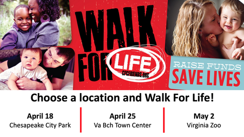During the month of April, we are partnering with the CPC of Tidewater in their Walk For Life. Stop by the Missions Room to pick up a fundraising brochure. Sign up to walk at one of the three locations and get sponsors. Every cent goes to help ministry to moms, dads, and babies.